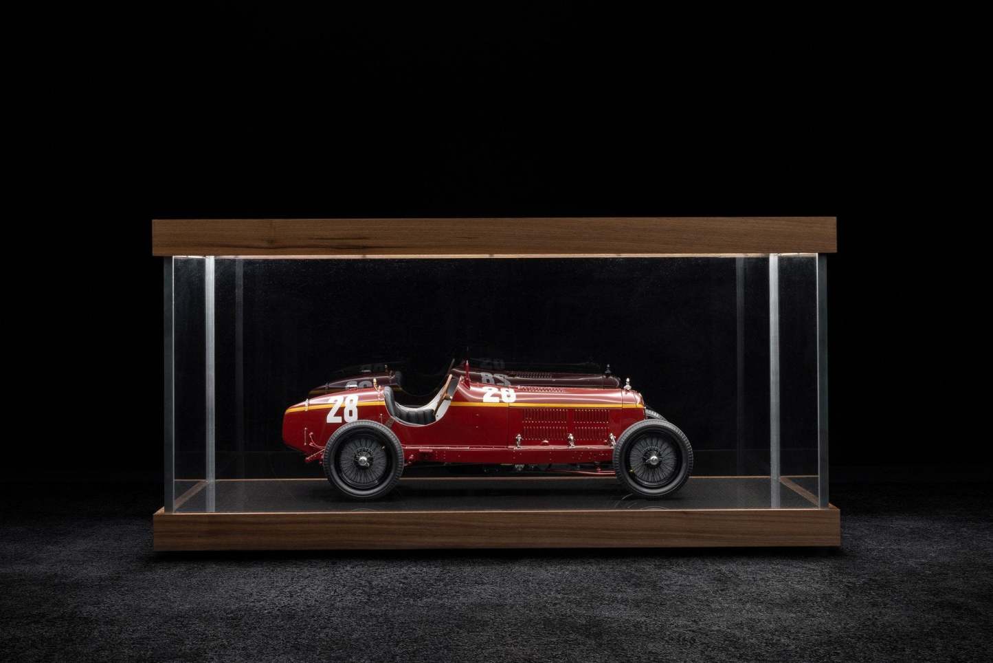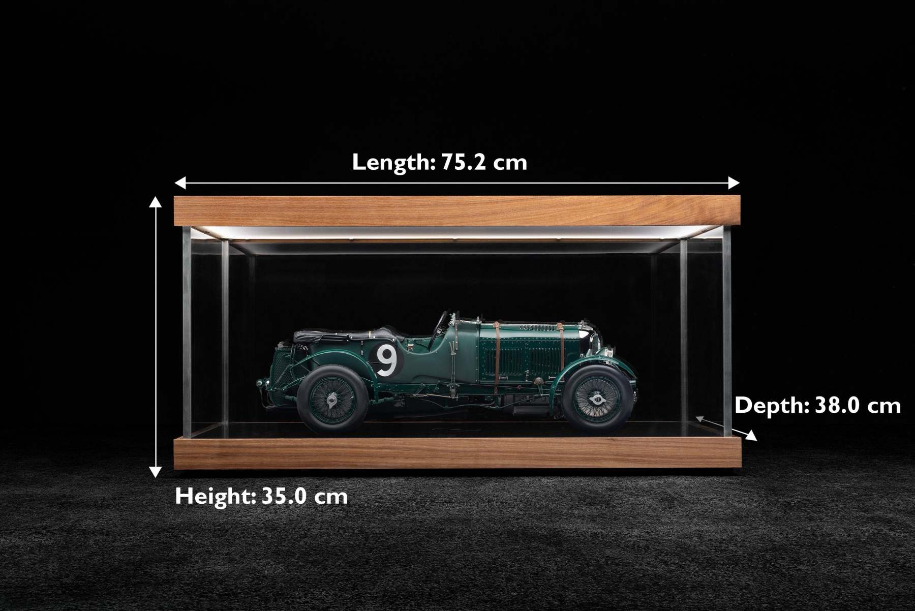 Designed to house one of Amalgam’s 1:8 scale GT models, this display case is made of solid walnut and incorporates a light tablet inspired by the lighting system used in Ralph Lauren’s private museum. With an even dispersal of silky light over the whole of the model, revealing the sleek lines of the body and intricate details, this display case would be perfect for one of our classic models. Discreet but complimentary, the display case ensures the model remains the focus of attention in terms of quality, finish and functionality.