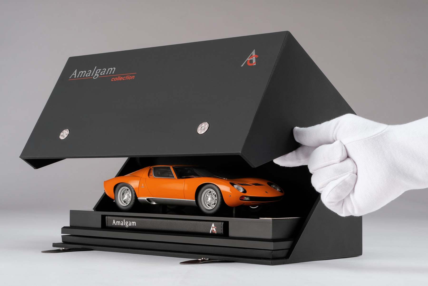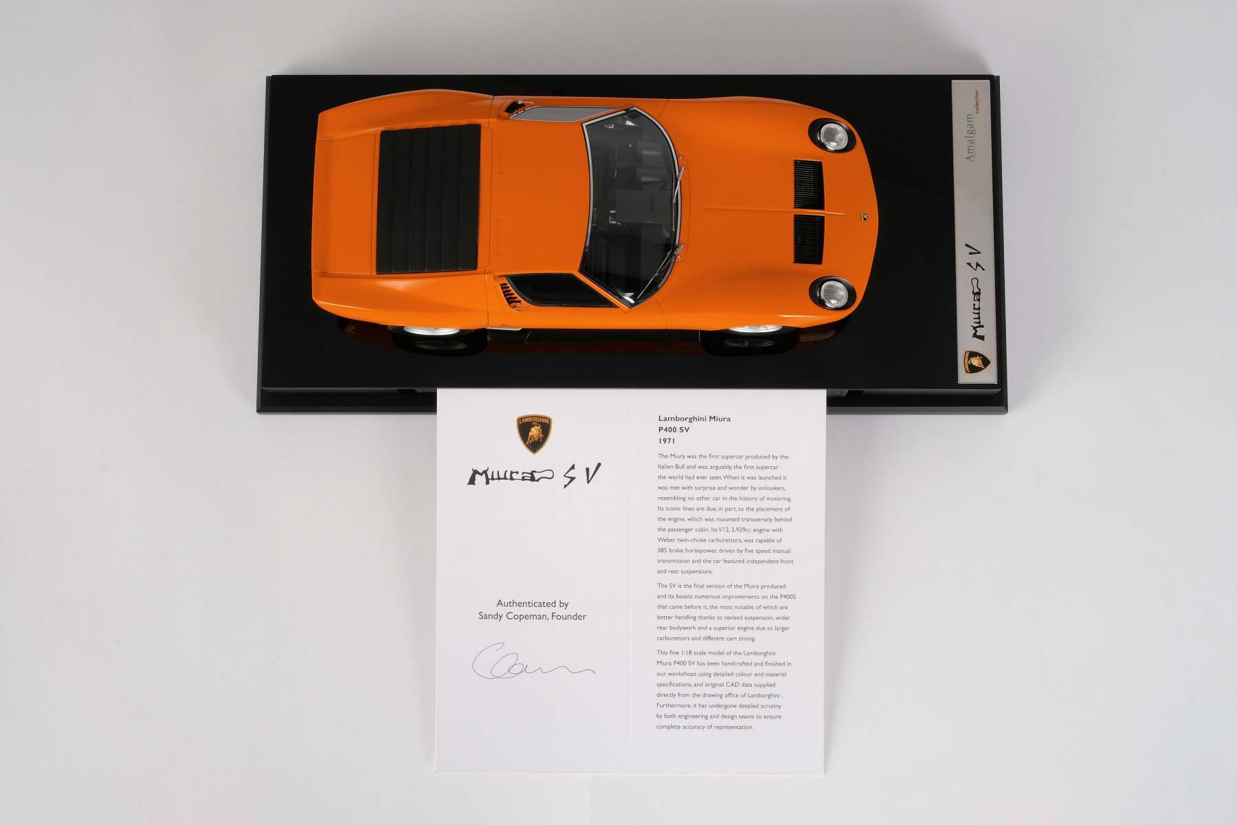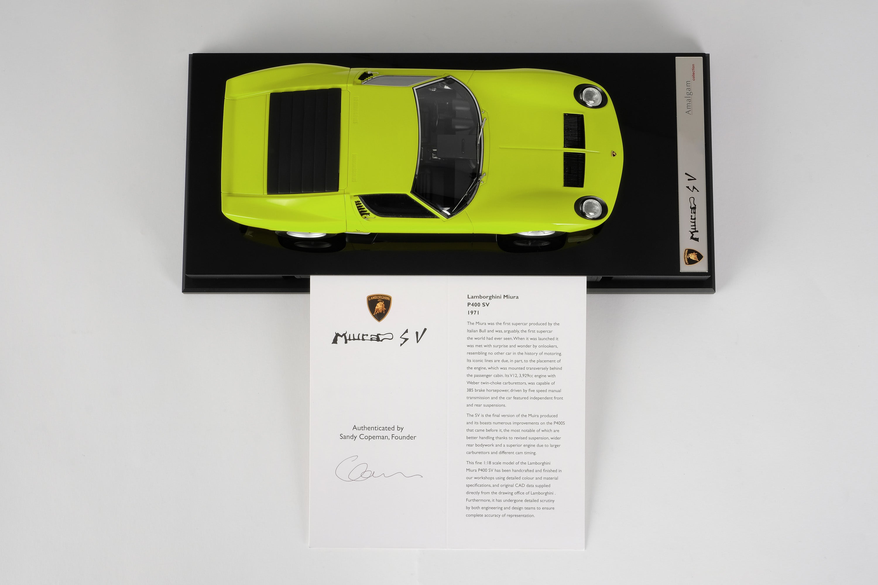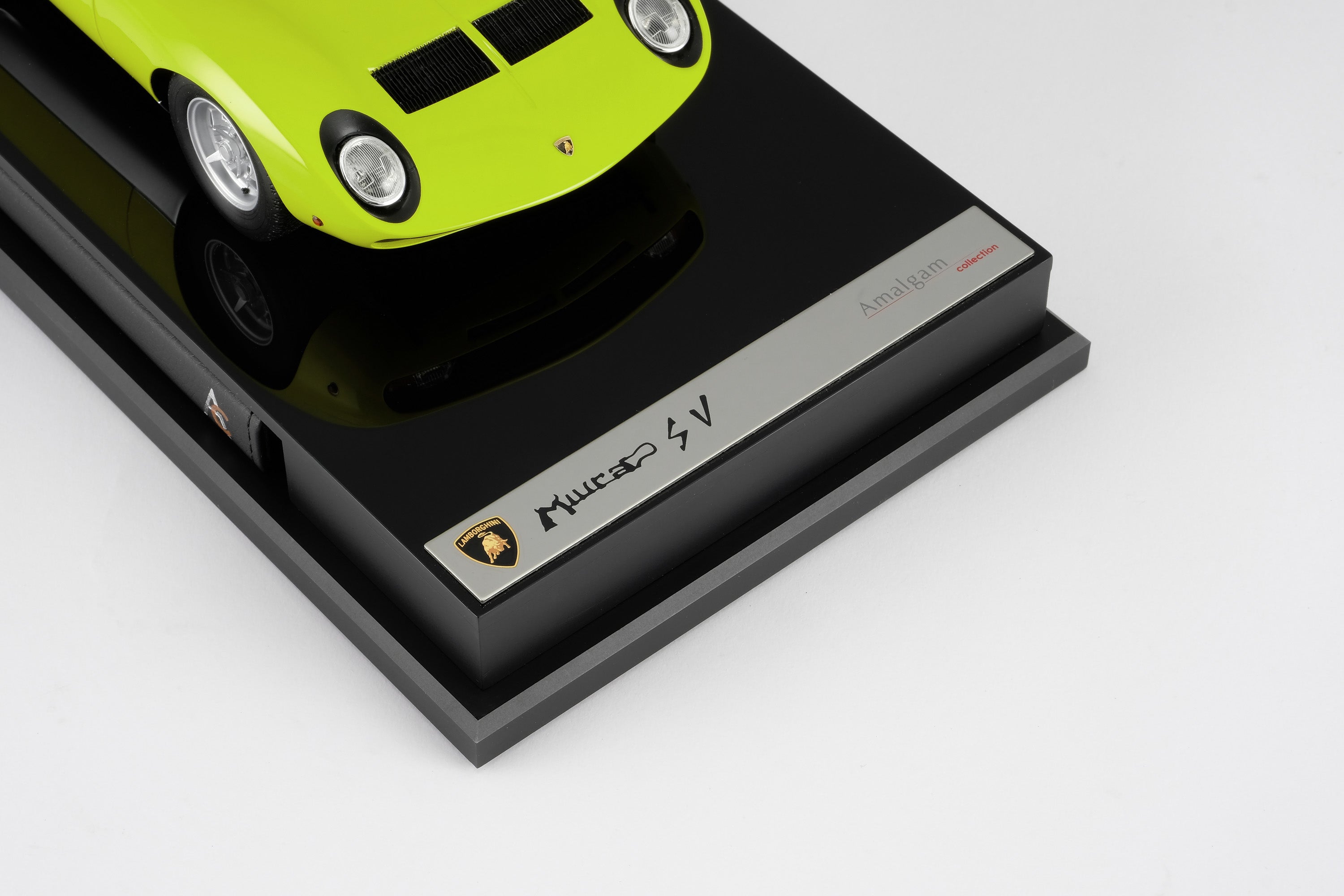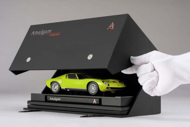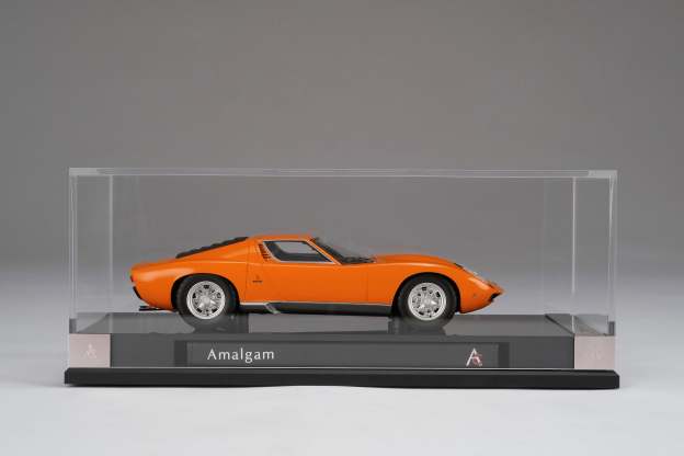 These perfect 1:18 scale models of the Lamborghini Miura P400 SV, available in Giallo, Verde Miura and Arancio Miura exterior paint scheme, have been handcrafted and finished in our workshops with the co-operation and assistance of Lamborghini regarding original finishes, materials, archive imagery and drawings. The use of supremely accurate digital scanning of the original car has allowed us to perfectly recreate every detail at scale. Furthermore, it has undergone detailed scrutiny by both engineering and design teams to ensure complete accuracy of representation. Every Amalgam 1:18 scale model is supplied in a luxury black presentation box and mounted on a carbon fibre or leather base protected by a clear acrylic dust cover. The model title, original branding and edition number are displayed on polished stainless-steel plaques mounted at the front end of the base.