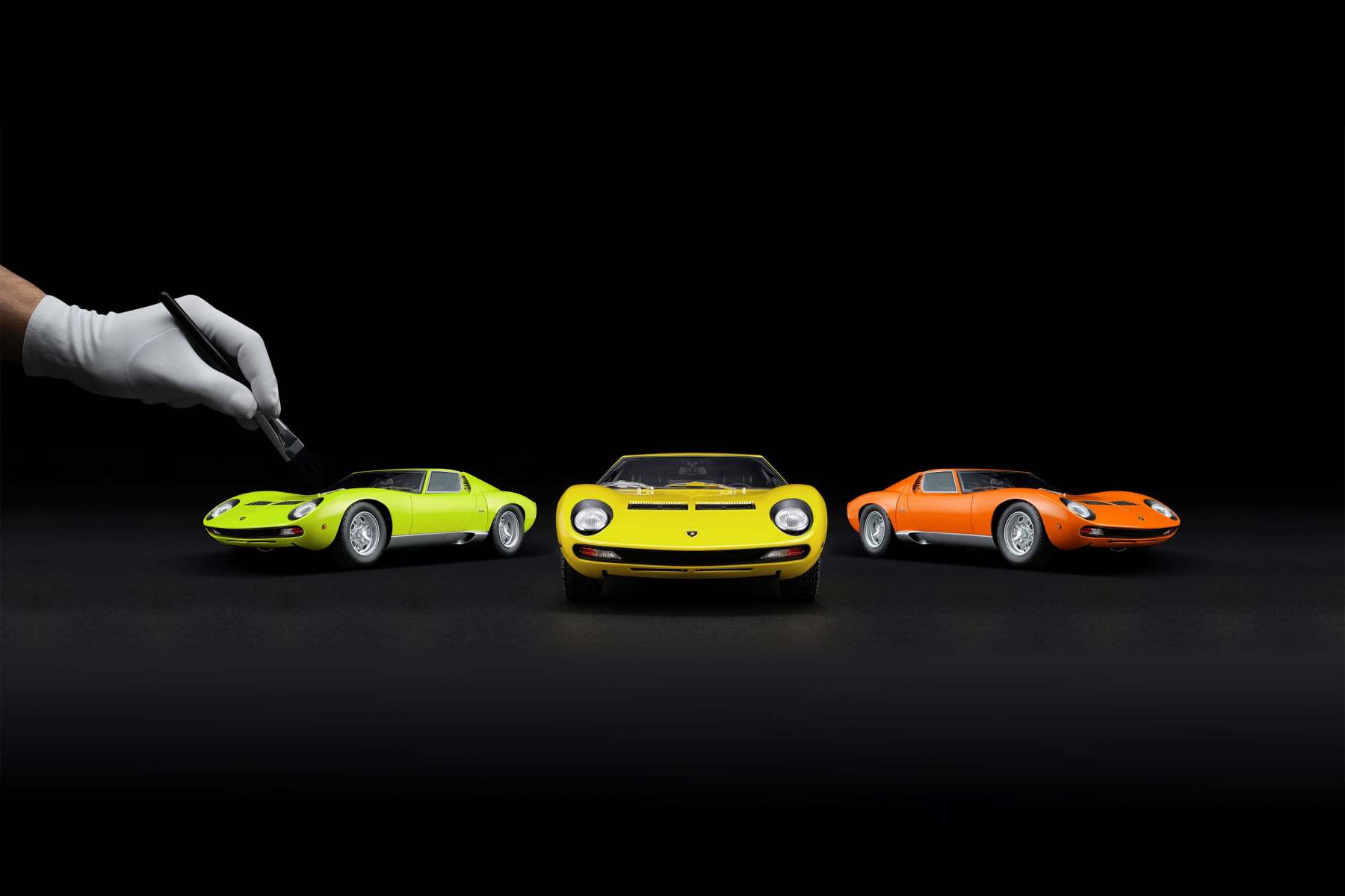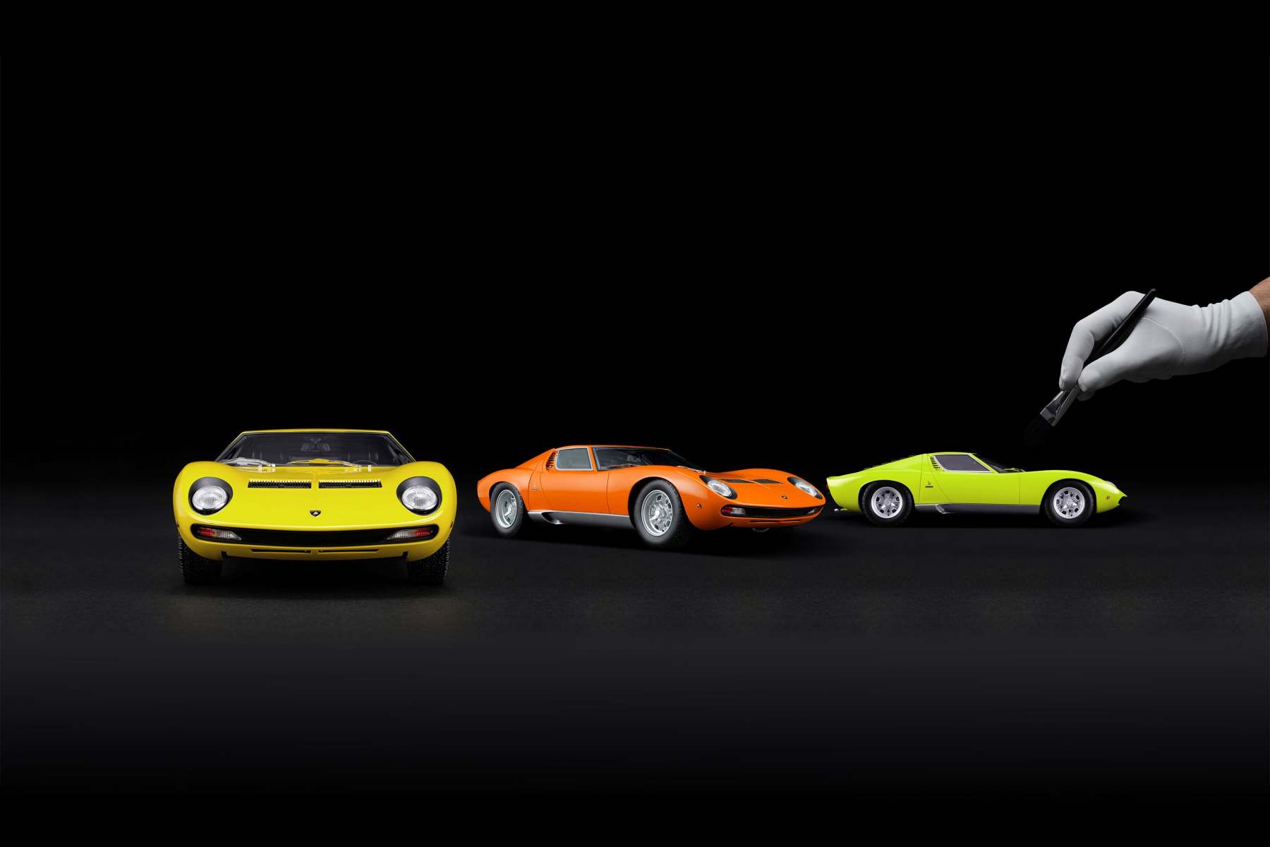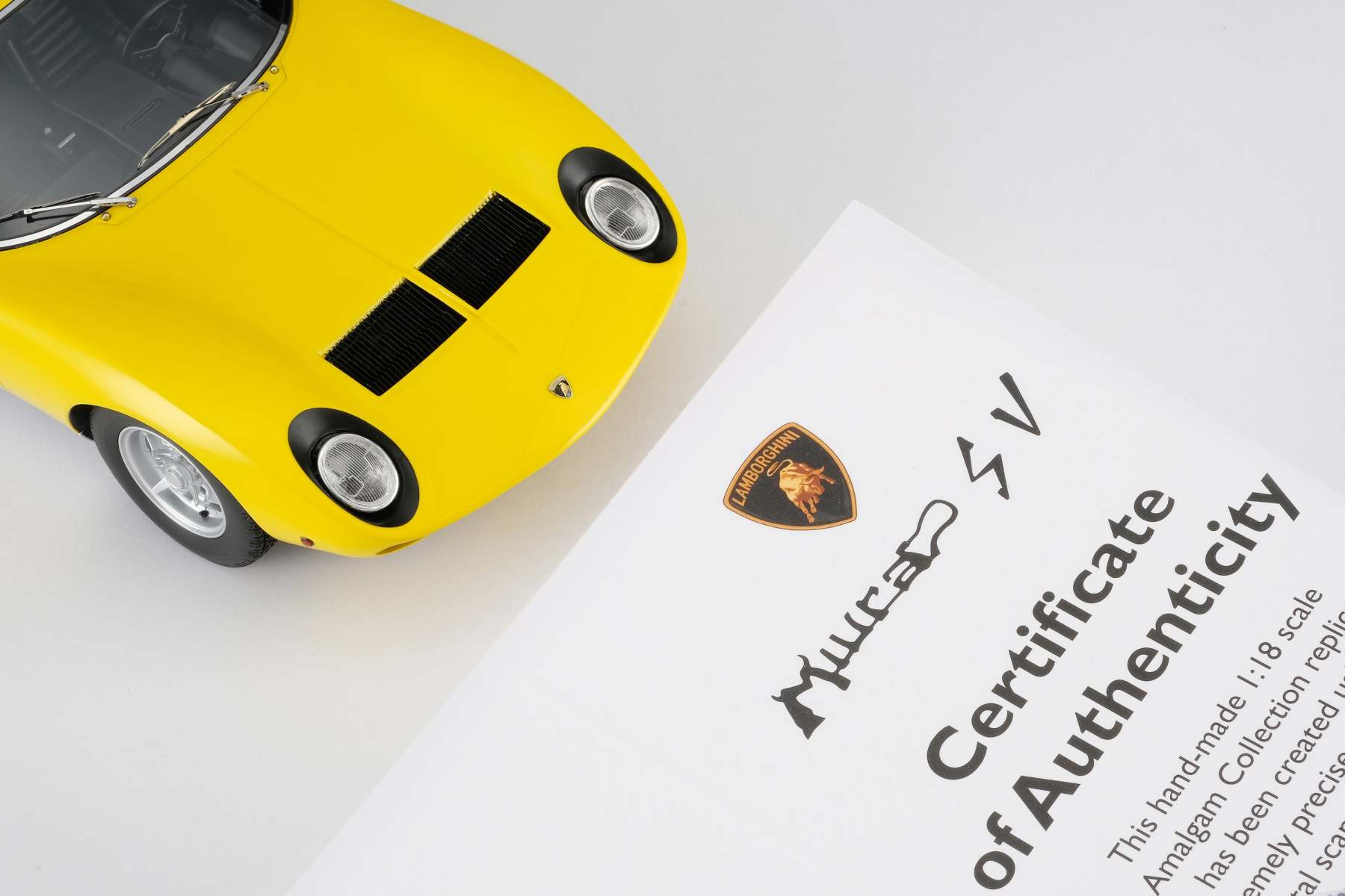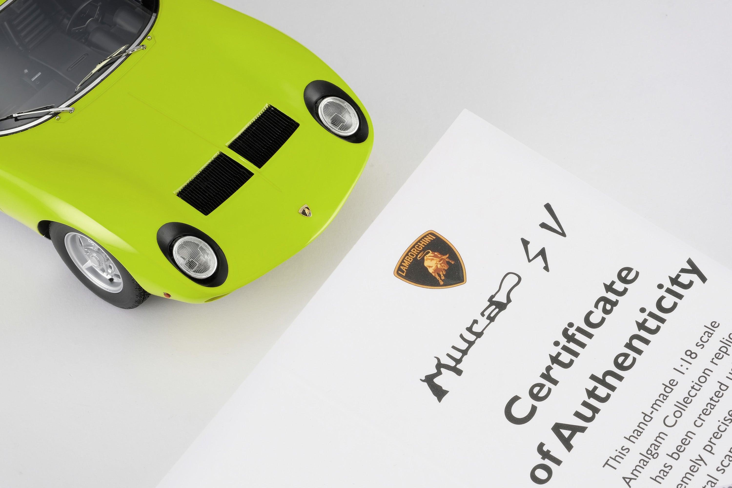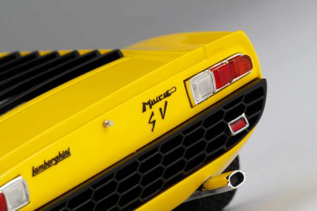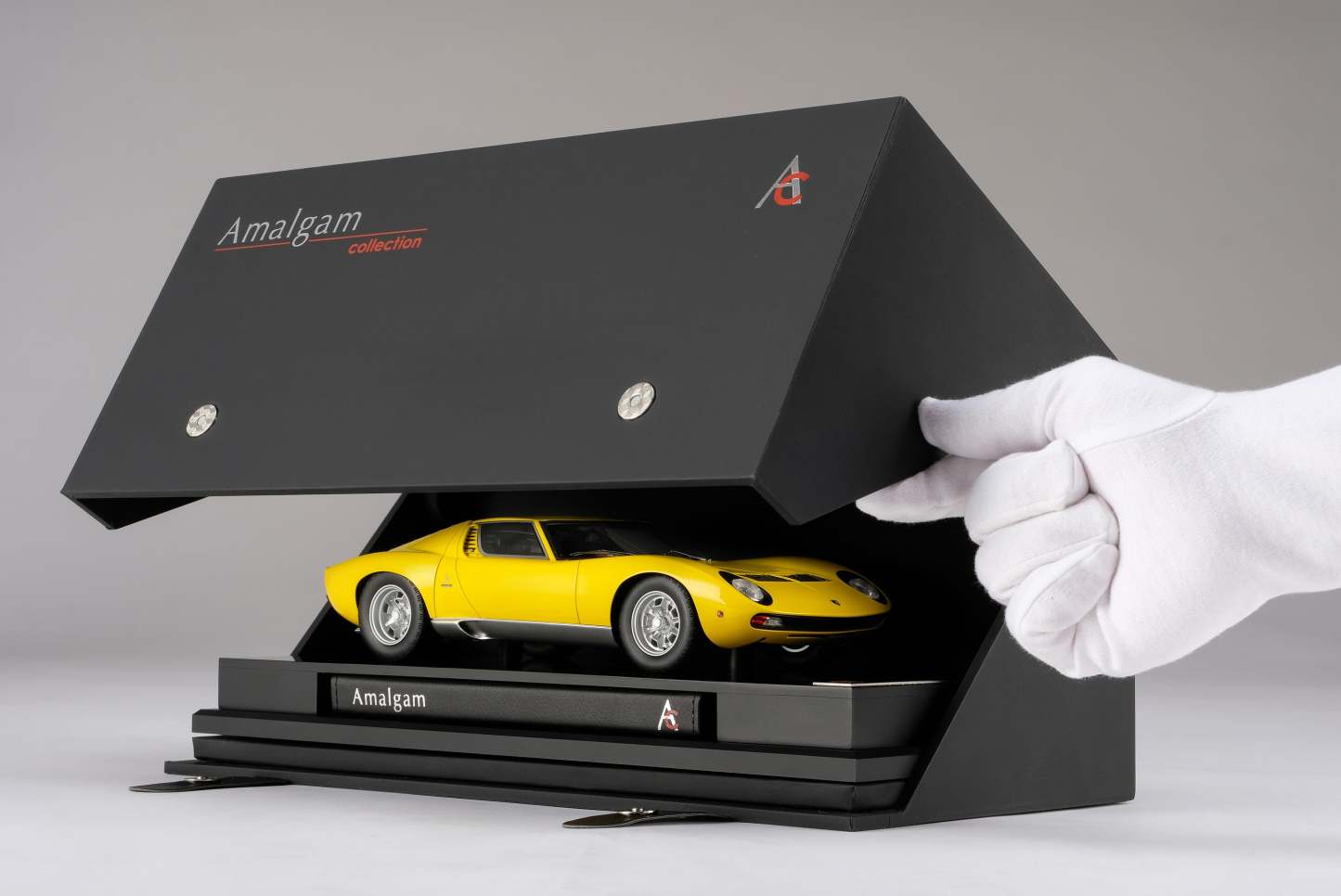 These perfect 1:18 scale models of the Lamborghini Miura P400 SV, available in Giallo, Verde Miura and Arancio Miura exterior paint scheme, have been handcrafted and finished in our workshops with the co-operation and assistance of Lamborghini regarding original finishes, materials, archive imagery and drawings. The use of supremely accurate digital scanning of the original car has allowed us to perfectly recreate every detail at scale. Furthermore, it has undergone detailed scrutiny by both engineering and design teams to ensure complete accuracy of representation. Every Amalgam 1:18 scale model is supplied in a luxury black presentation box and mounted on a carbon fibre or leather base protected by a clear acrylic dust cover. The model title, original branding and edition number are displayed on polished stainless-steel plaques mounted at the front end of the base.