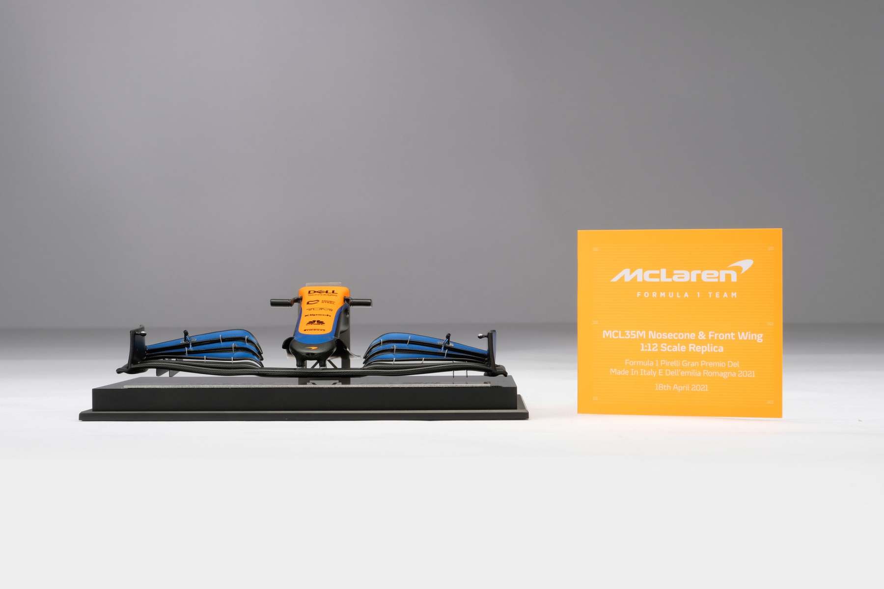 This fine 1:12 scale model of the McLaren MCL35M nosecone is as raced at the Formula 1 Pirelli Gran Premio del Made in Italy e dell'Emilia Romagna 2021 by Lando Norris and Daniel Ricciardo at the Autodromo Internazionale Enzo e Dino Ferrari in Imola, Italy, on the 18th of April 2021. In a fantastic weekend for McLaren, Norris earned his second career podium in third position, while Ricciardo finished in sixth position in just his second race for the team. Norris could have even started on the front row for the first time in his career had he not breached track limits at the fast Piratella curve, leading to his time being deleted. Instead, he started seventh, just behind his Australian teammate in sixth. Minor contact on a wet opening lap knocked Norris down as far as ninth, but he was able to recover, pass opponents and was soon line astern with Ricciardo, with the pair running in fifth and sixth. A tactical switch of the drivers put the faster Norris in clean air. A calculated pit stop on laps 27 and 28 gained Norris more than 13 seconds and meant he could overtake the Red Bull of Sergio Pérez, who needed to serve a penalty and change a steering wheel during his own stop. On lap 32, the race was red flagged after a high speed collision between Mercedes’ Valtteri Bottas and the Williams of George Russell. At the race’s restart, a bold strategy call was made to put Used Soft tyres on both cars. Norris’ immediate overtake of the Ferrari of Charles Leclerc quickly vindicated the decision, though the tyres soon lost performance and the McLaren duo came under pressure from their pursuers. Norris was eventually passed by a recovering Lewis Hamilton in the closing stages but held off Leclerc to record his second podium finish for the team. Ricciardo resisted the pressure from Alpha Tauri’s Pierre Gasly to come home sixth.