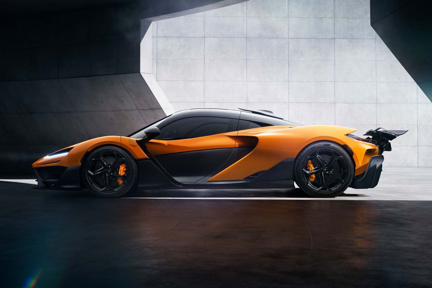 At the heart of W1 is an all-new High-Performance Hybrid powertrain, comprising McLaren’s all-new MHP-8 V8 combustion engine, an all-new E-module (integrating a radial flux electric motor and motor control unit), and an 8-speed transmission with E-reverse. Power and torque are to the rear wheels only, through an E-differential, to deliver scintillating speed. The epic power of this all-new 1275PS High-Performance Hybrid powertrain, and McLaren’s relentless dedication to lightweight engineering, has resulted in levels of performance previously only attainable by track-only supercars and race cars. Engineered for epic power delivery and breathtaking performance, the powertrain gives the highest-ever power output of any McLaren and, when combined with a vehicle weight of 1,399kg, delivers an astonishing power-to-weight ratio of 911PS/tonne for W1 – the highest-ever for any road-legal McLaren and more importantly, best-in-class. This huge amount of power, together with total torque of 1340Nm and instant throttle response from the E-module, gives W1 astonishing acceleration figures: 0-100km/h (62mph) takes 2.7 seconds, 0–200km/h (124mph) is possible in just 5.8 seconds and 0-300km/h (186mph) can be achieved in under 12.7 seconds. It is the fastest-accelerating and fastest-lapping road-legal McLaren ever, being quicker than a Speedtail to 300km/h (186mph) and 3 seconds a lap ahead of a McLaren Senna on McLaren’s Nardo reference track.